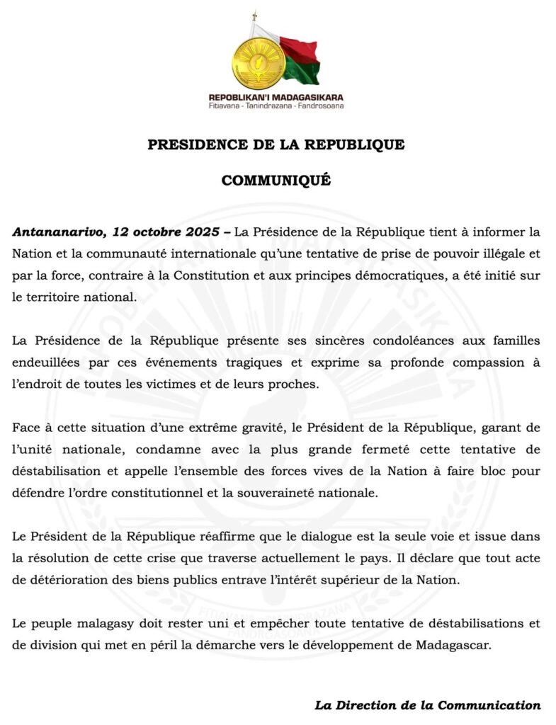 Madagascar est à un tournant historique. Depuis le 11 octobre 2025, une partie de l’armée a rejoint les manifestants. Ces derniers dénoncent la corruption, les coupures d’eau et d’électricité, et surtout le régime autoritaire d’Andry Rajoelina. Introuvable depuis plusieurs jours, le président français de Madagascar a fait publier un communiqué sur Facebook dénonçant une « tentative de prise de pouvoir illégale et par la force » — une accusation hypocrite venant d’un homme arrivé au pouvoir par un coup d’Etat en 2009 et détenteur de la nationalité française. Acculé, Andry Rajoelina semble donc jouer sa dernière carte en tentant une énième fois de décrédibiliser le mouvement. Mais personne n’est dupe. Une révolution est en marche, portée par un peuple déterminé à reconquérir sa souveraineté. Et rien ni personne ne l’arrêtera.