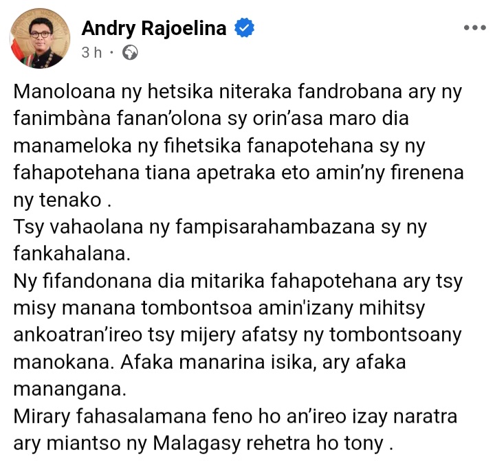 Face à la manifestation de grande ampleur du 25 septembre, le président français de Madagascar, Andry Rajoelina, est sorti du silence ce matin, vendredi 26 septembre, à 10h52. Et voici son message posté sur Facebook. Notez qu’il a pris soin de verrouiller les commentaires.