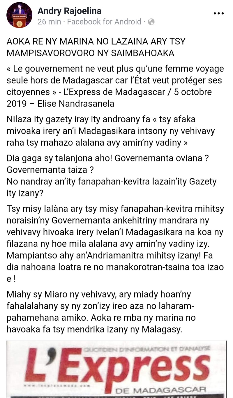 Suite au tollé provoqué par l’article de l’Express de Madagascar intitulé « Voyage à l’extérieur – Restriction de sortie pour les femmes », Andry Rajoelina a publié un communiqué sur sa page Facebook, désavouant totalement ce journal appartenant à Edgard Razafindravahy (voir capture-écran).
