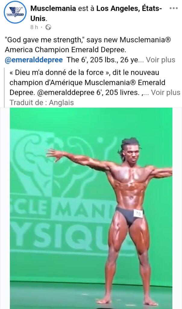 Je pense qu’il a juste gagné un prix dans une catégorie. Le vrai champion, c’est Emerald Depree, c’est pour ça que Musclemania ne parle que de lui. En tout cas, c’est ce que j’ai compris.