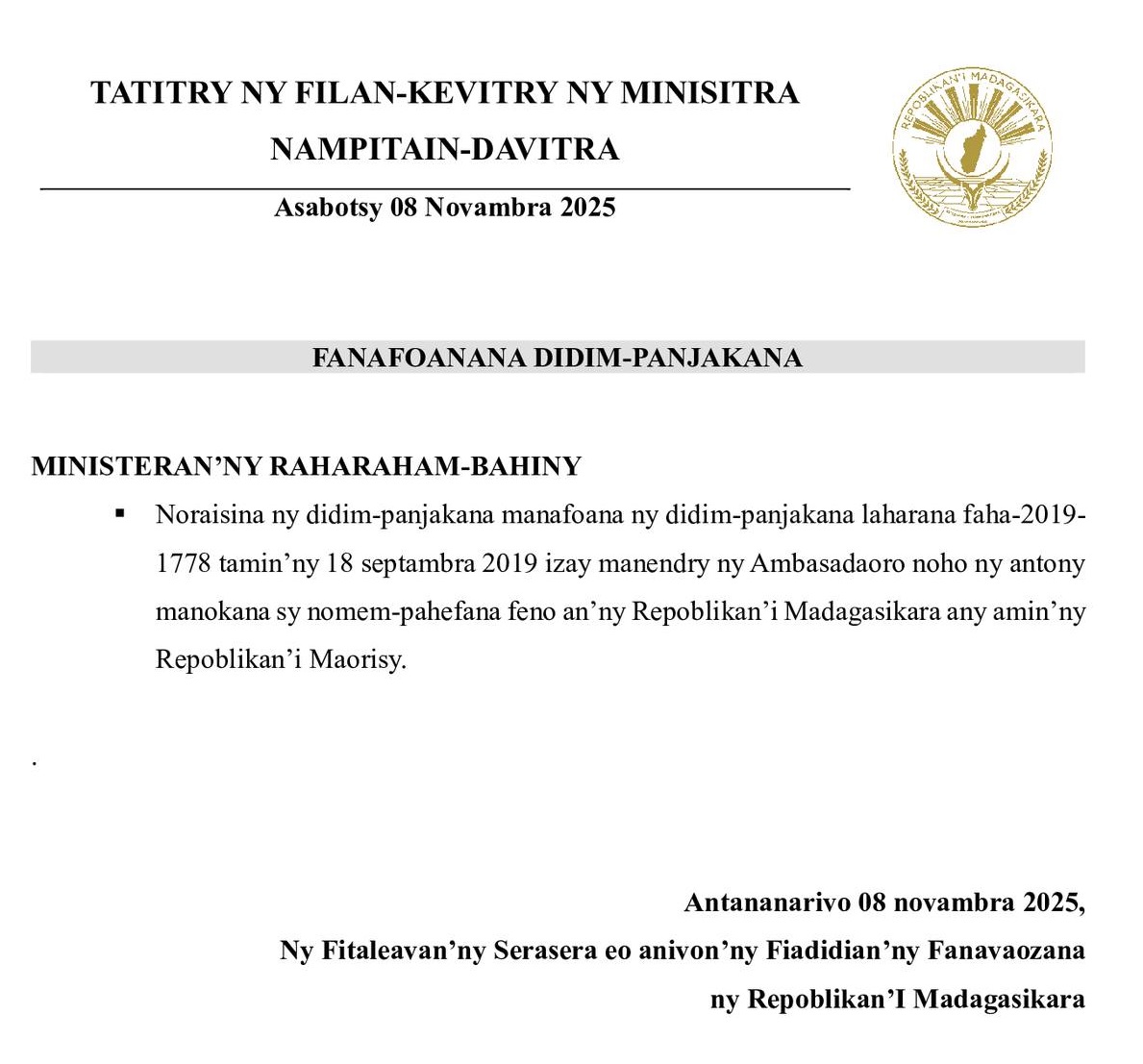 Depuis la nomination de Fanirisoa Ernaivo au ministère de la Justice, un vent de nettoyage sans précédent souffle sur les hautes sphères de l’État malgache. Les responsables soupçonnés de corruption tombent les uns après les autres, signe d’un tournant décisif dans la lutte contre l’impunité. Dernier en date : Camille Vital, ambassadeur de Madagascar à Maurice. Il a été limogé hier lors du conseil des ministres. Proche d’Andry Rajoelina, il avait plaidé pour la fuite l’évacuation sanitaire de Mamy Ravatomanga, pourtant impliqué dans des dossiers louches.