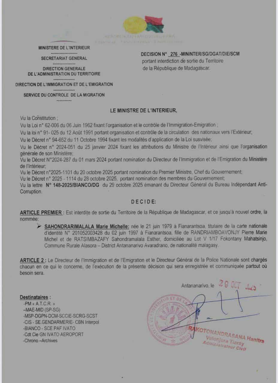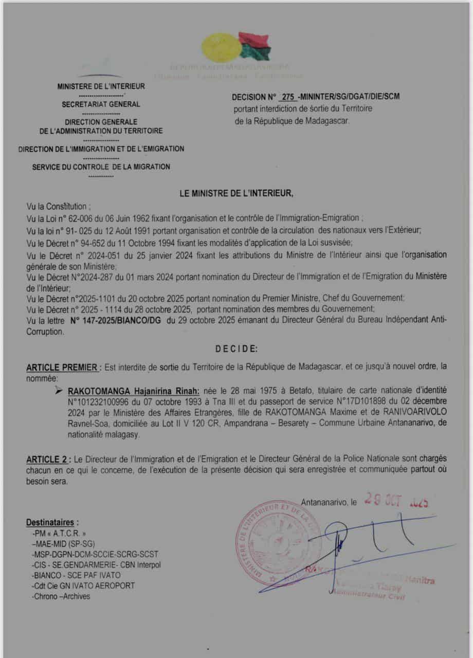 Le ministère de l’Intérieur a annoncé, le 29 octobre 2025, que deux anciennes collaboratrices d’Andry Rajoelina, ex-président français de Madagascar, sont désormais interdites de sortie du territoire. Il s’agit de Marie Michelle Sahondrarimalala, ancienne ministre de l’Éducation nationale, et de Rinah Rakotomanga, ex-conseillère à la présidence. Les motifs officiels n’ont pas été précisés, mais les soupçons sont nombreux.