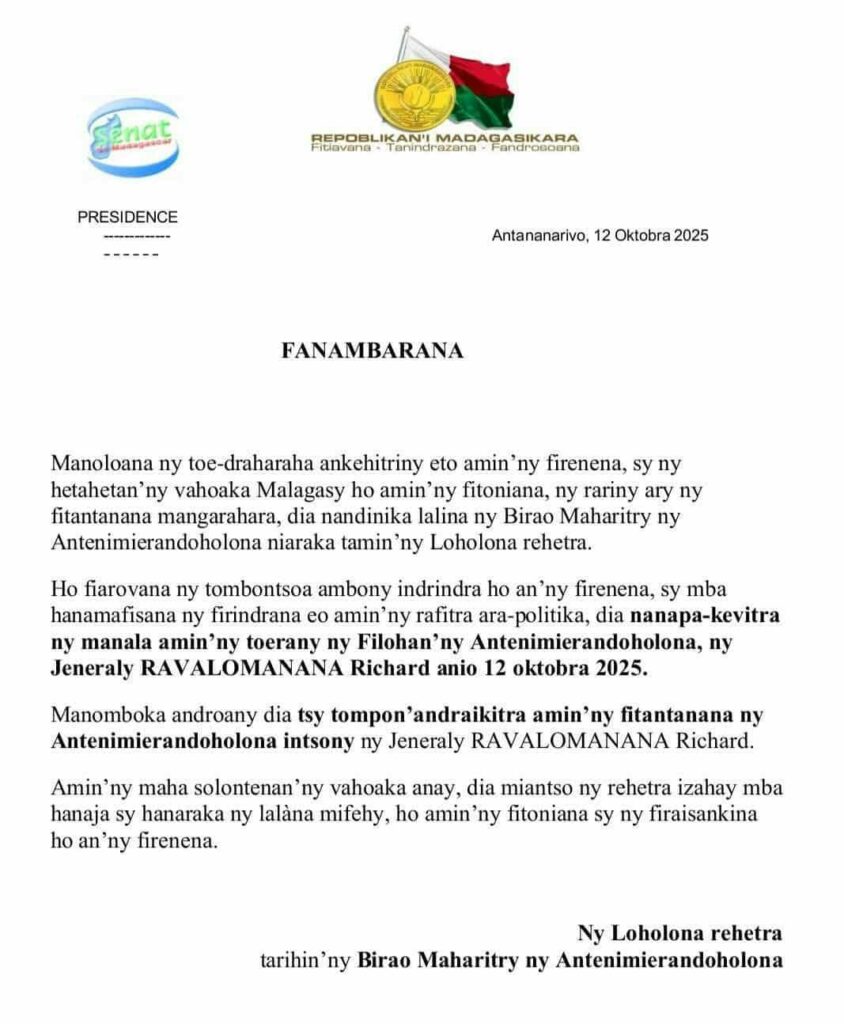 Considéré comme intouchable, le général Richard Ravalomanana, fidèle allié d’Andry Rajoelina, a été démis de ses fonctions de président du Sénat ce 12 octobre 2025 par le Bureau permanent du Sénat, avec l’appui unanime des sénateurs. Ce fervent opposant aux manifestations, connu pour son arrogance et ses menaces envers le peuple, paie aujourd’hui le prix de son mépris. Il est égalemeny soupçonné de haute trahison, notamment dans l’affaire des Boeing 777. Selon les informations qui circulent, celui-ci se serait enfui à Dubaï.