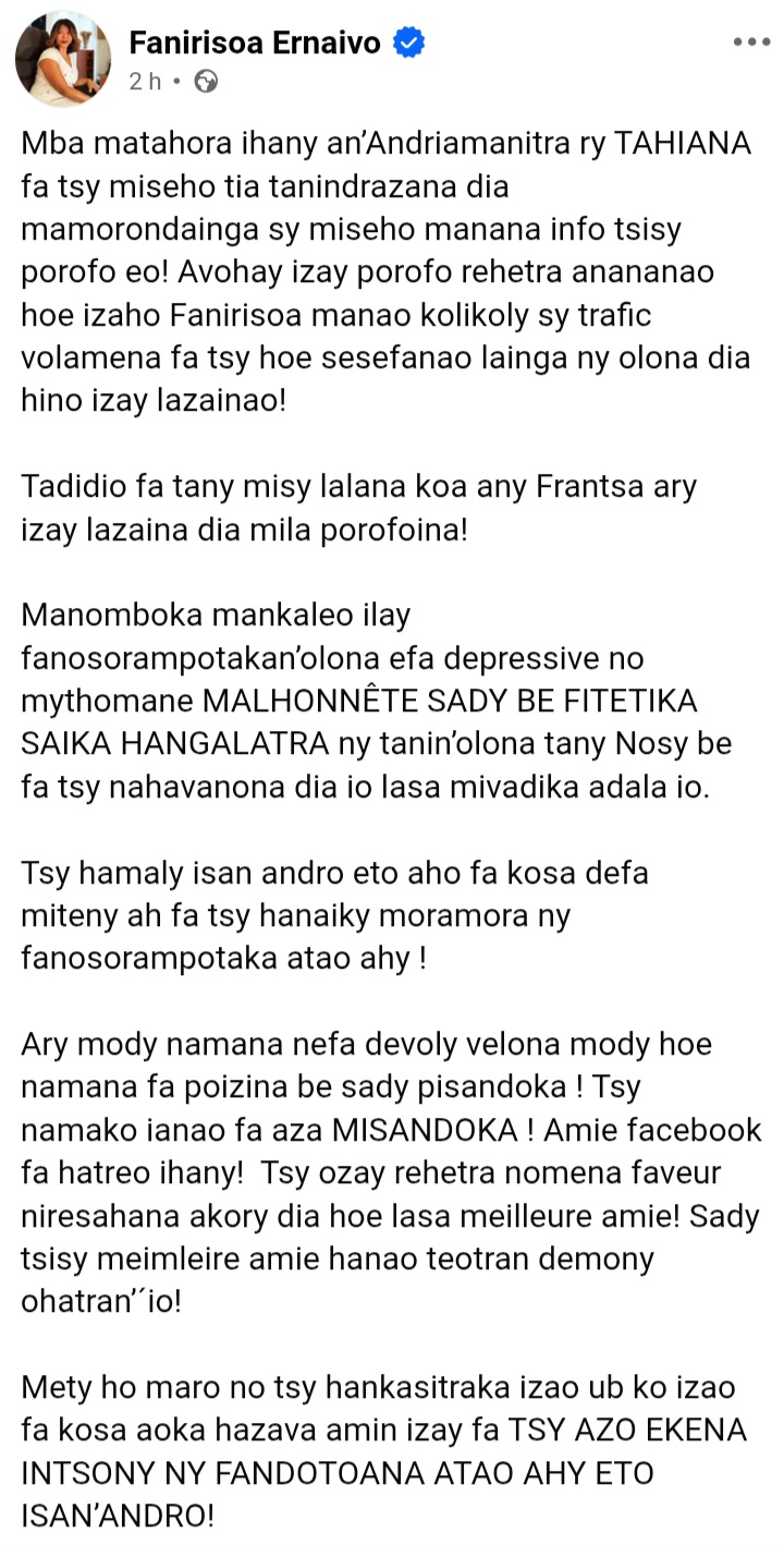Pendant près de cinq mois, Fanirisoa Ernaivo avait choisi de ne pas répondre publiquement à ces attaques. Cependant, face à la répétition quotidienne des accusations, elle a finalement décidé de briser le silence. Dans une publication ferme, elle dénonce une campagne de diffamation et rappelle que les accusations doivent être étayées par des éléments vérifiables, y compris lorsqu’elles sont émises depuis l’étranger.