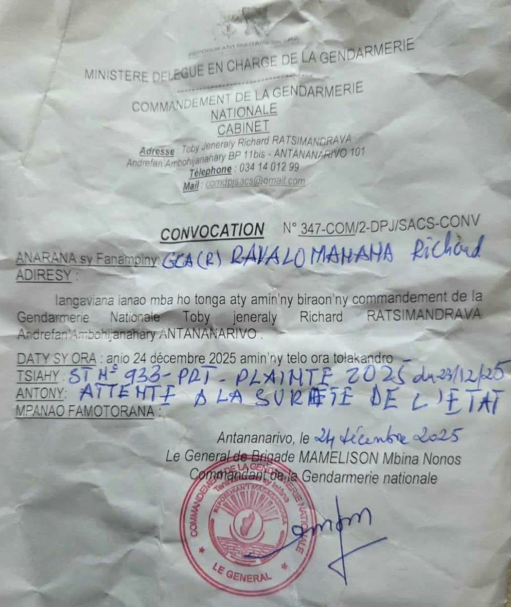 Alors qu’on le croyait réfugié à l’étranger, le général Richard Ravalomanana se trouve bel et bien à Madagascar. Une présence lourde de conséquences : il a été convoqué ce jour à la gendarmerie pour « atteinte à la sûreté de l’Etat ». Un incroyable retournement de situation pour celui qui incarnait la répression aux côtés d’Andry Rajoelina. Richard Ravalomanana a également été démis de ses fonctions de président du Sénat, perdant en quelques semaines une influence qu’il croyait acquise. Cette chute rappelle une vérité essentielle : aucun pouvoir bâti sur la terreur n’est éternel.