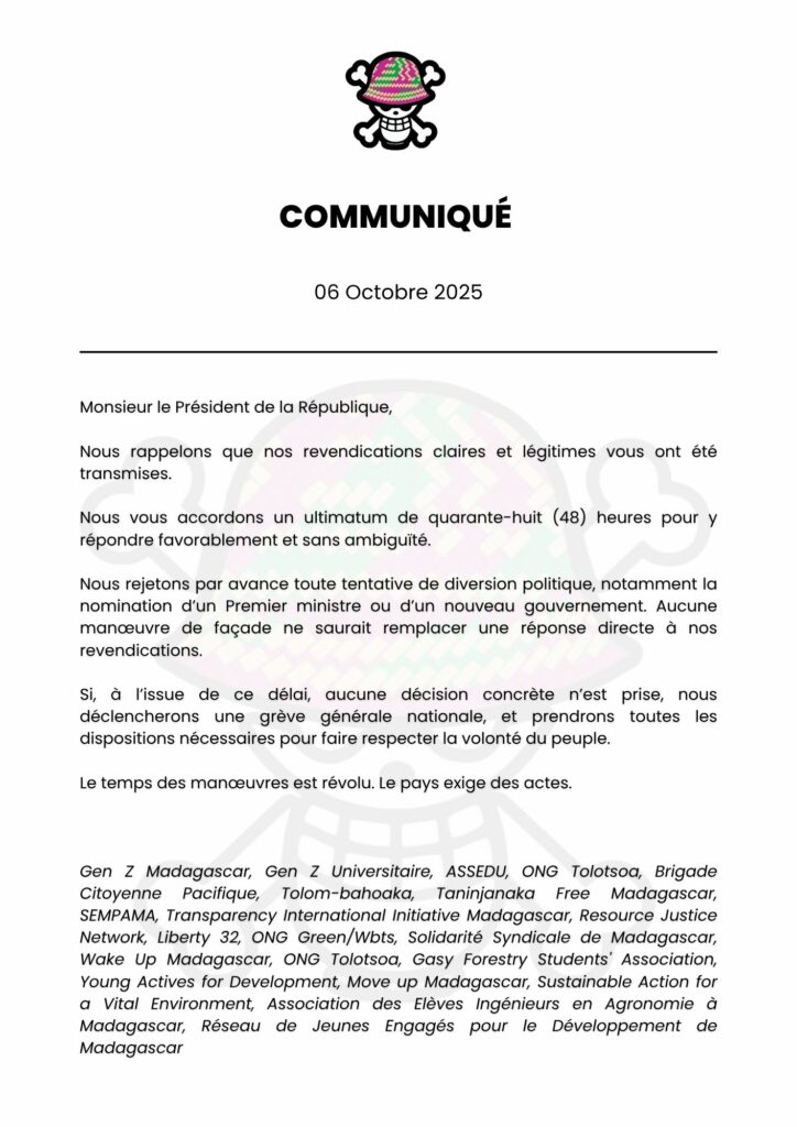 Suite à la nomination du nouveau Premier ministre, Fortunat Ruphin Zafisambo, un général de l’armée, les manifestants ont rapidement réagi via un communiqué (voir ci-dessous). Pour rappel, le président français de Madagascar, Andry Rajoelina, avait auparavant sous-entendu qu’ils étaient des abrutis facilement influençables par des robots imaginaires sur les réseaux sociaux. Sachant que l’armée est en partie responsable des 22 morts comptabilisés par l’ONU lors des manifestations, cette nomination est perçue comme une nouvelle provocation contre les manifestants. Cette fois-ci, ils appellent à une grève générale.