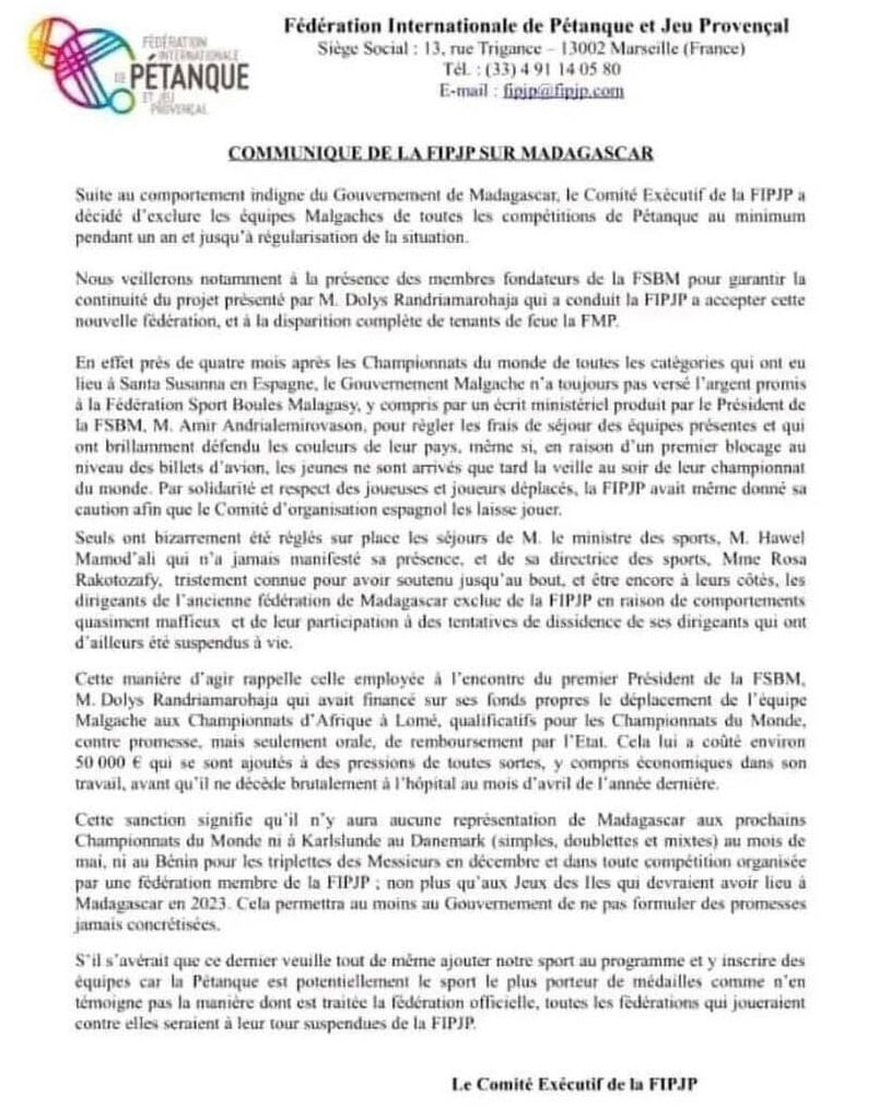 Selon un communiqué de la FIPJP (Fédération internationale de Pétanque et Jeu provençal), Madagascar ne pourra participer à aucune compétition internationale de pétanque pendant un an, et jusqu’à la régularisation des dépenses liées à la participation aux championnats du monde 2021. Très remonté, le Comité exécutif de la FIPJP parle même de « comportement indigne du gouvernement de Madagascar ». Ambiance…