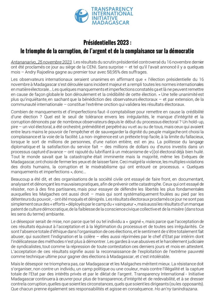 Ce communiqué de Transparency s’adresse aux naïfs qui pensent encore que la communauté internationale ne validera pas les élections bidonnées à Madagascar. La communauté internationale défendra toujours ses propres intérêts en priorité, quitte à aider à l’installation d’un dictateur au pouvoir. Ceci est valable dans toute l’Afrique et Madagascar. Qu’importe s’il y a des morts, qu’importe les drames humains, qu’importe les morts de faim, qu’importe les prisonniers politiques, tout cela n’est rien pour eux. Le plus important à leurs yeux, c’est l’argent et leurs intérêts économiques.