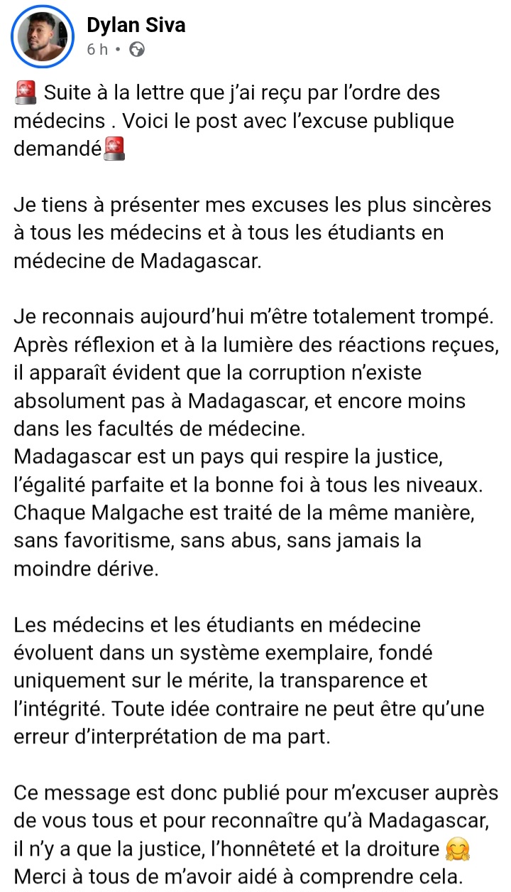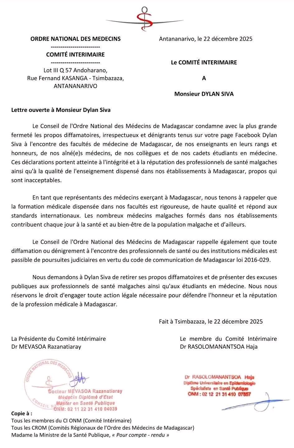 En réaction, le Conseil de l’Ordre national des Médecins de Madagascar a publié un communiqué officiel condamnant fermement ces propos, jugés diffamatoires et attentatoires à l’honneur de la profession. L’institution a exigé des excuses publiques ainsi que le retrait des déclarations incriminées. Cependant, Dylan Siva n’a pas accédé à cette demande. Au lieu de présenter des excuses sincères, il a publié un message ironique, tournant en dérision le Conseil de l’Ordre. Une attitude perçue par de nombreux observateurs comme un mépris affiché envers les institutions locales.