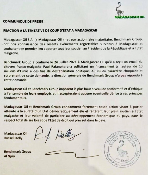 L’enquête se poursuit dans le cadre de la tentative d’assassinat d’Andry Rajoelina. Aux dernières nouvelles, Benchmark Group, un des actionnaires de Madagascar Oil, a confirmé avoir bien été contacté par le suspect Paul Rafanoharana pour renverser Andry Rajoelina. Les enquêteurs ont d’ailleurs réussi à récupérer la fameuse lettre. Bien qu’elle n’ait pas donné suite, l’entreprise pourrait tout de même être poursuivie pour ne pas avoir alerté les autorités malgaches. Le point avec ce reportage vidéo par Africa News.